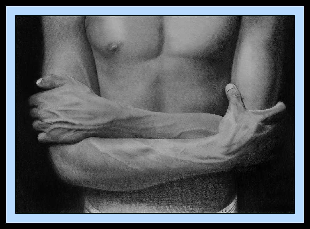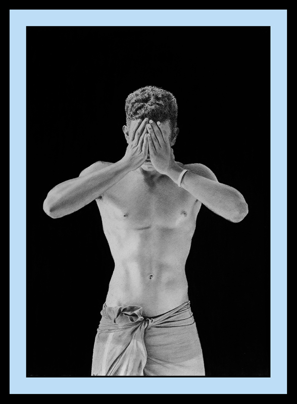 Drawn with graphite, carbon and charcoal pencils; 41 x 29 cms. Private collection.
