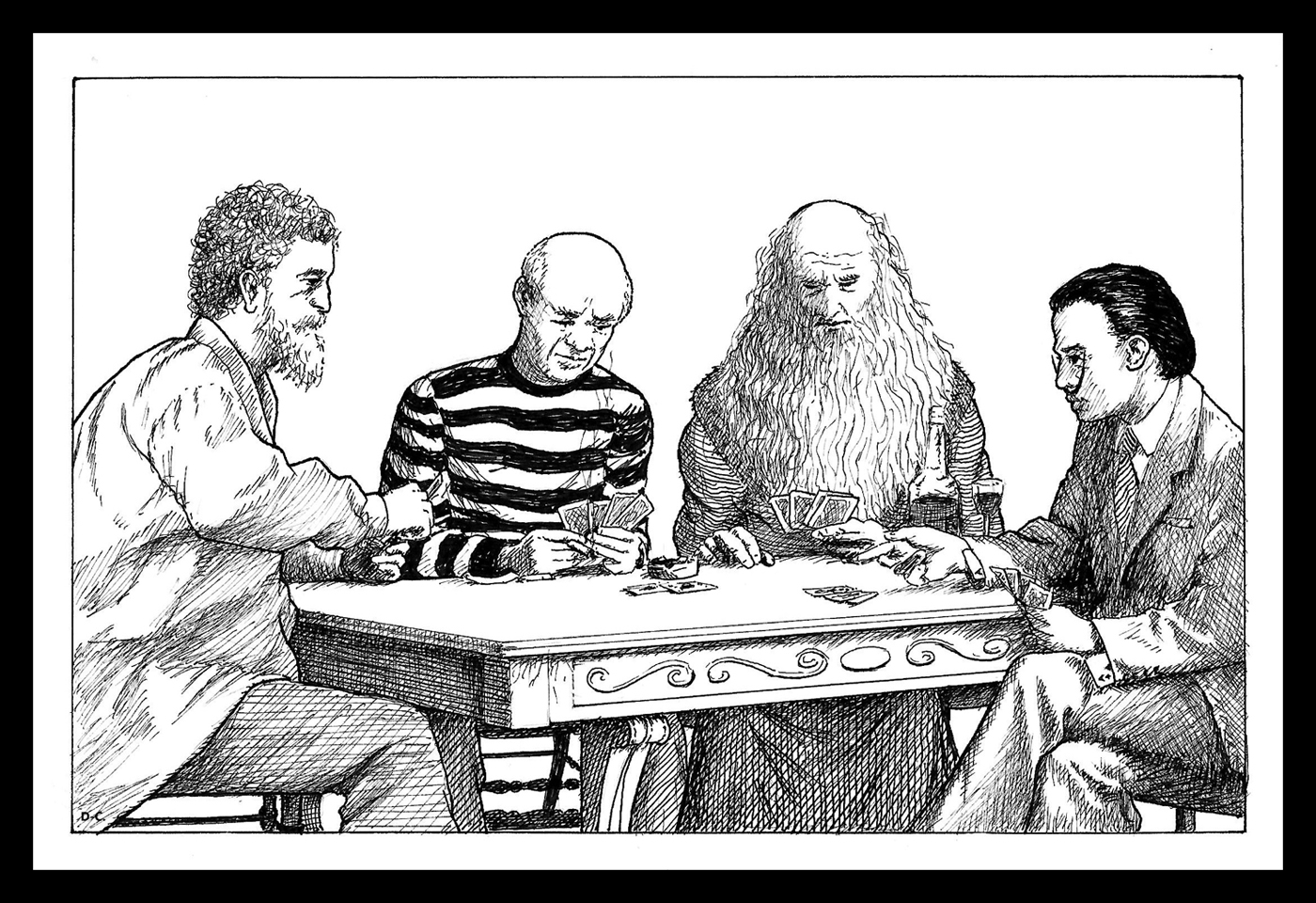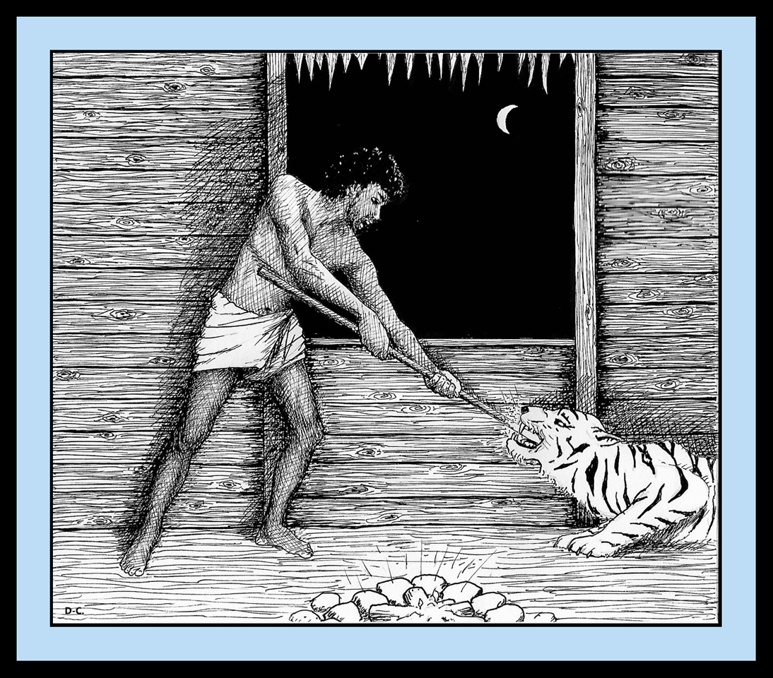 Illustration to to the Sri Lankan folk tale of Maha and Heen Gamaya and the tiger. Ink on paper; 24 x 21 cms.