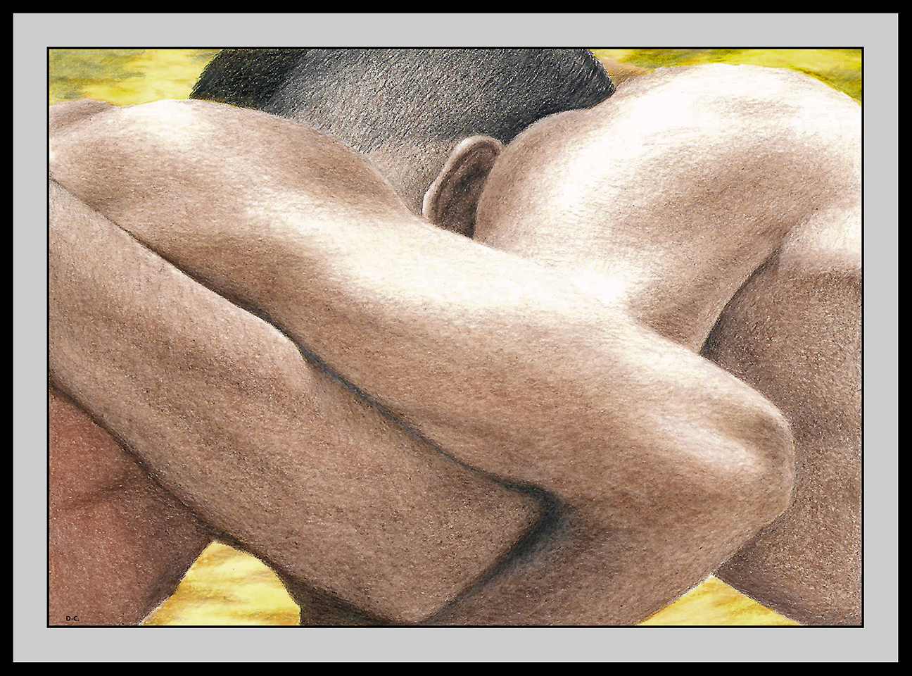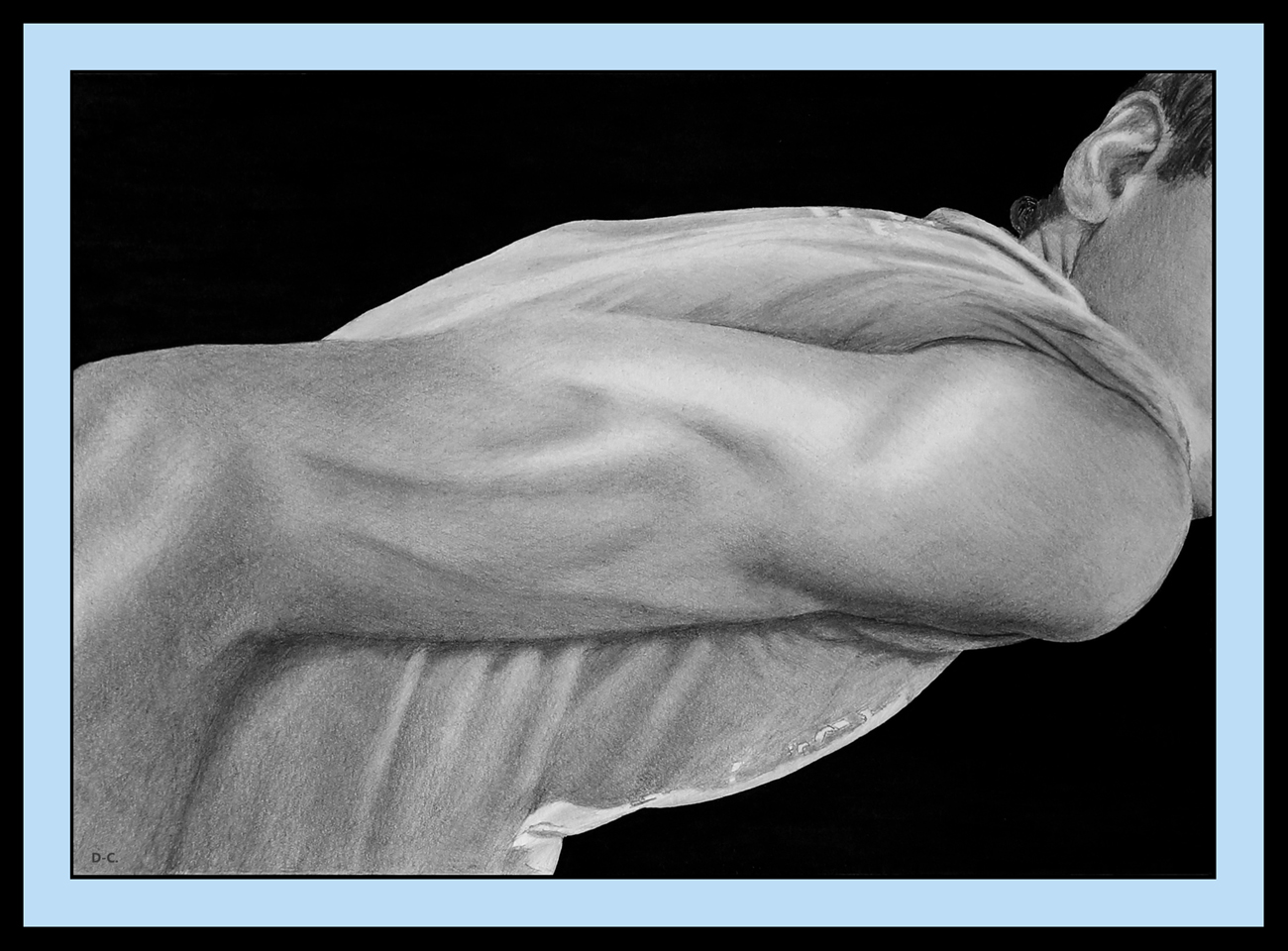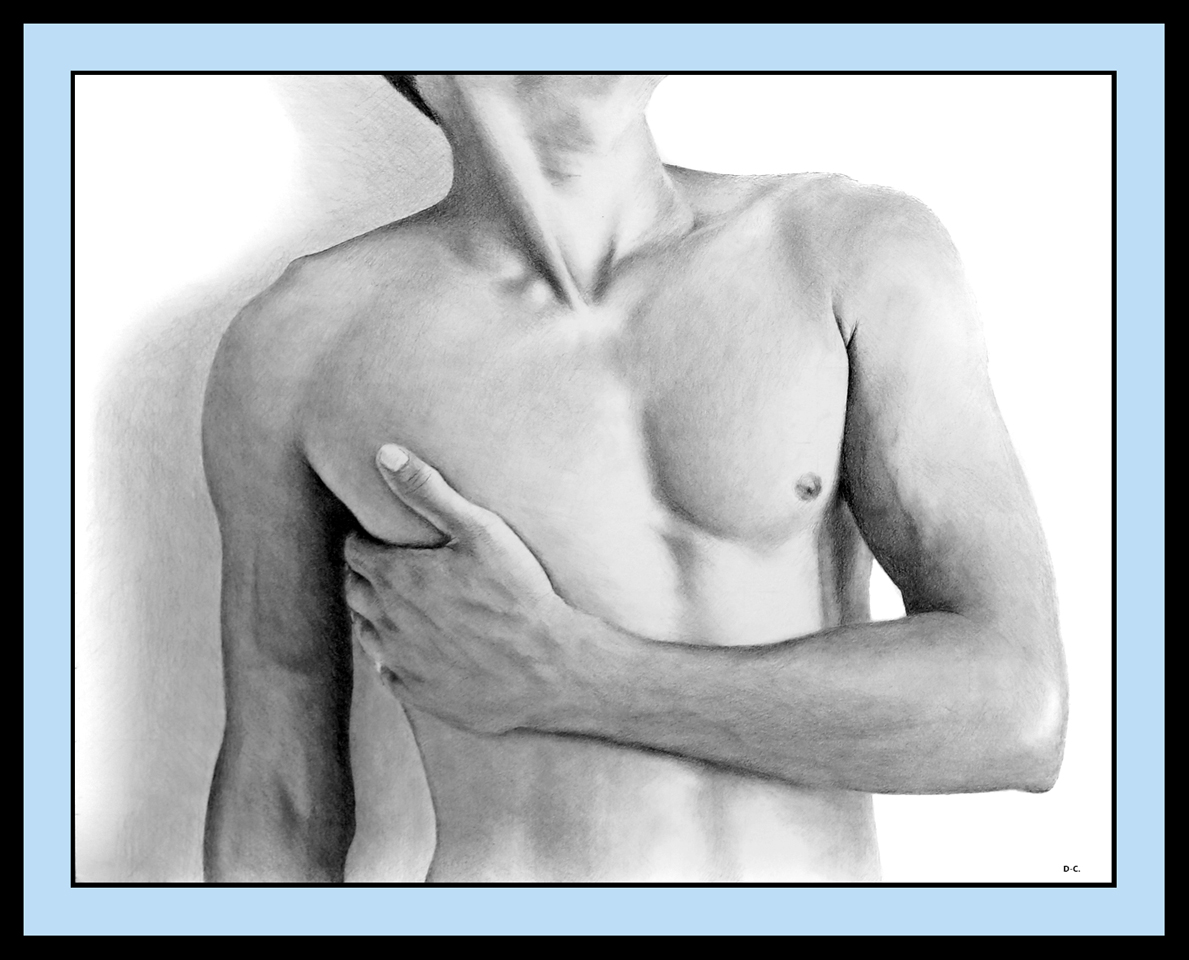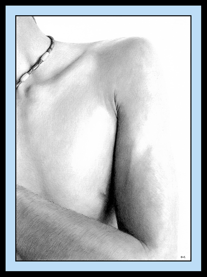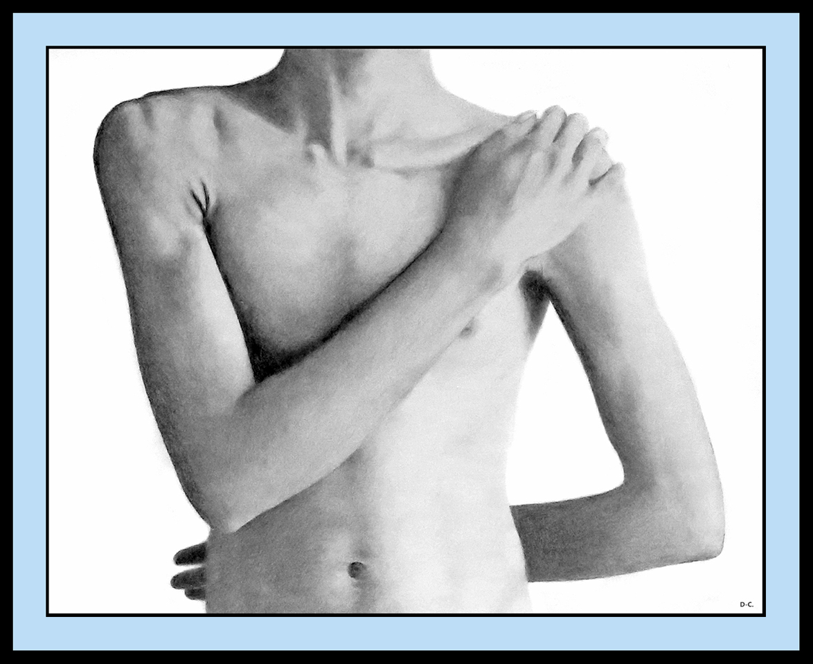 Drawn with graphite, carbon and charcoal pencils on paper; 21 x 29.7 cms. Private collection.