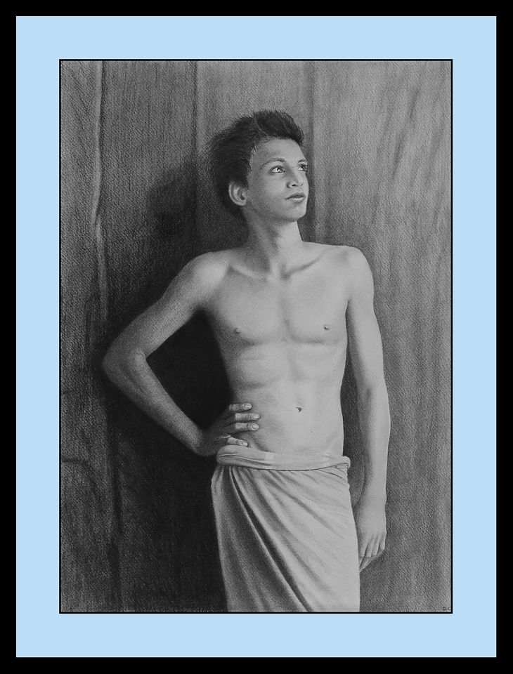 Drawn with graphite, carbon and charcoal pencils; 41 x 29 cms. Private collection.