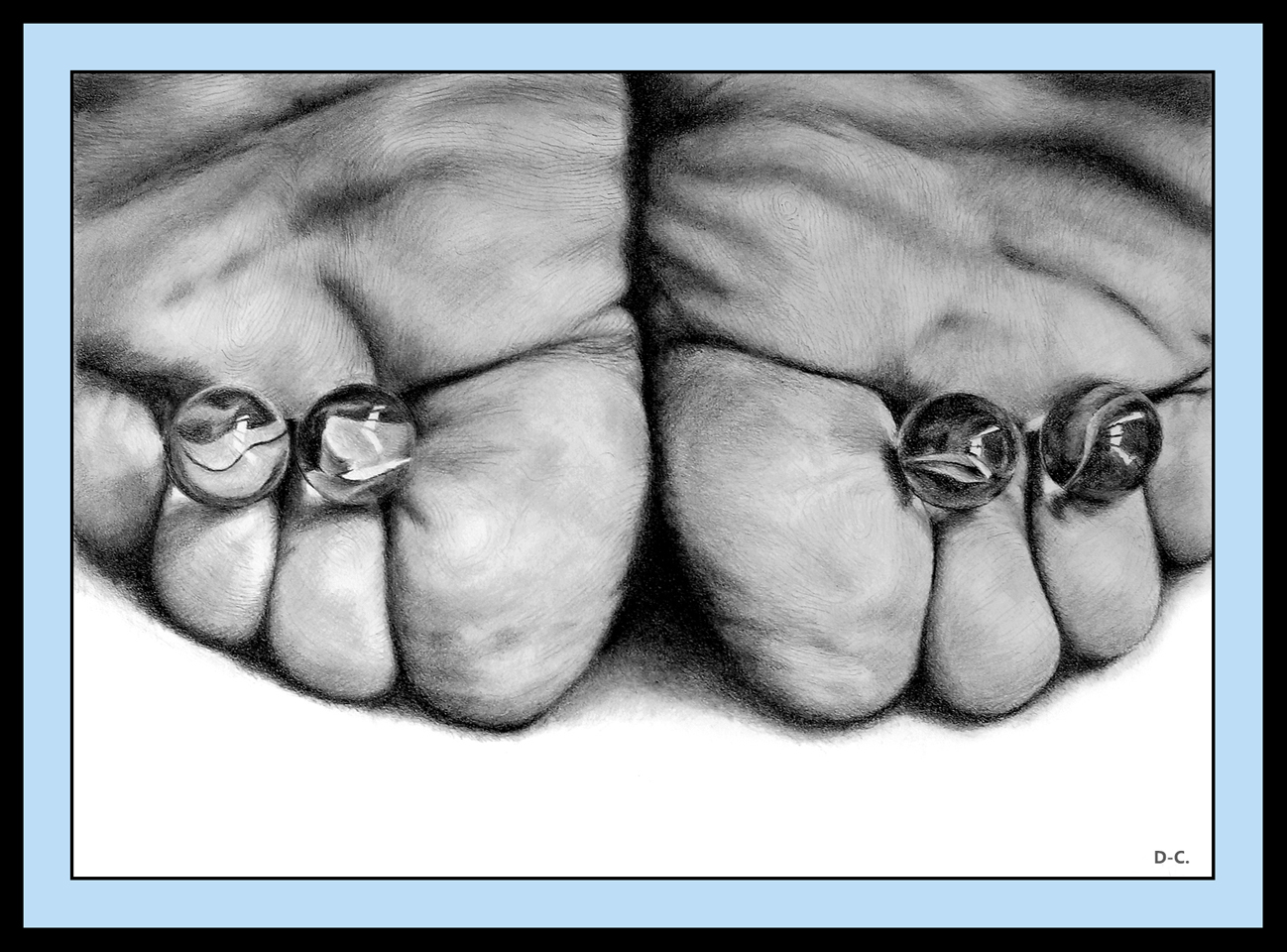 Graphite pencil drawing; 35 x 25 cms. With this drawing I was intrigued by the visual contrasts between our opaque living bodies and the hard semi-transparent reality of glass marbles.